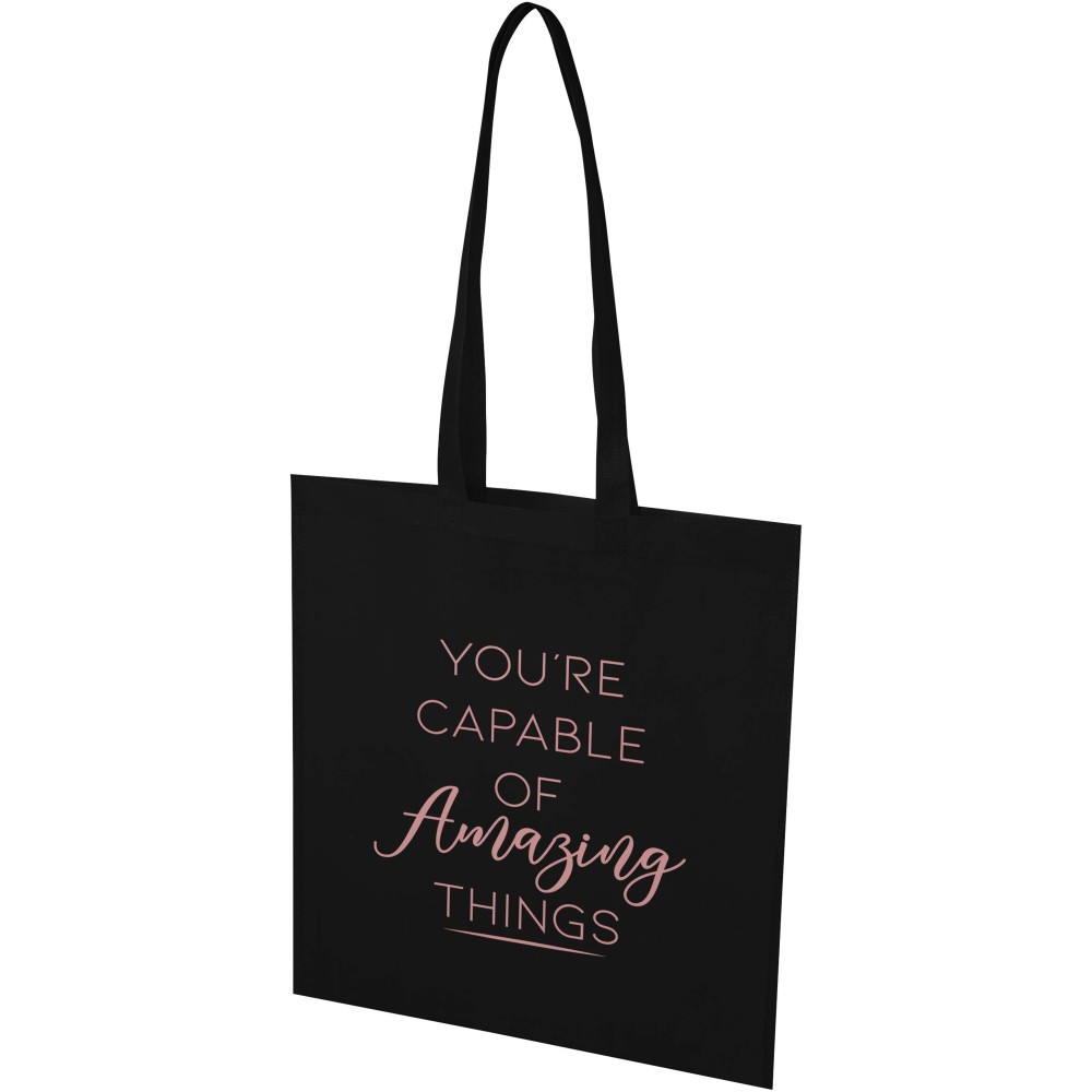 Az EcoSeal GRS tanúsítvánnyal rendelkező, újrahasznosított bevásárlótáska tartós és szakadásálló RPET anyagból készült. Ultrahangos hőhegesztéssel készült, varrásmentes kivitelben, stancolt fülekkel. A 30 cm hosszú fülek kényelmes hordozást biztosítanak. Könnyű, mégis erős szerkezete akár 5 kg súly hordozására is alkalmas. Ideális mindennapi használatra, vásárokra vagy promóciós ajándékként. Űrtartalom: 6 liter.