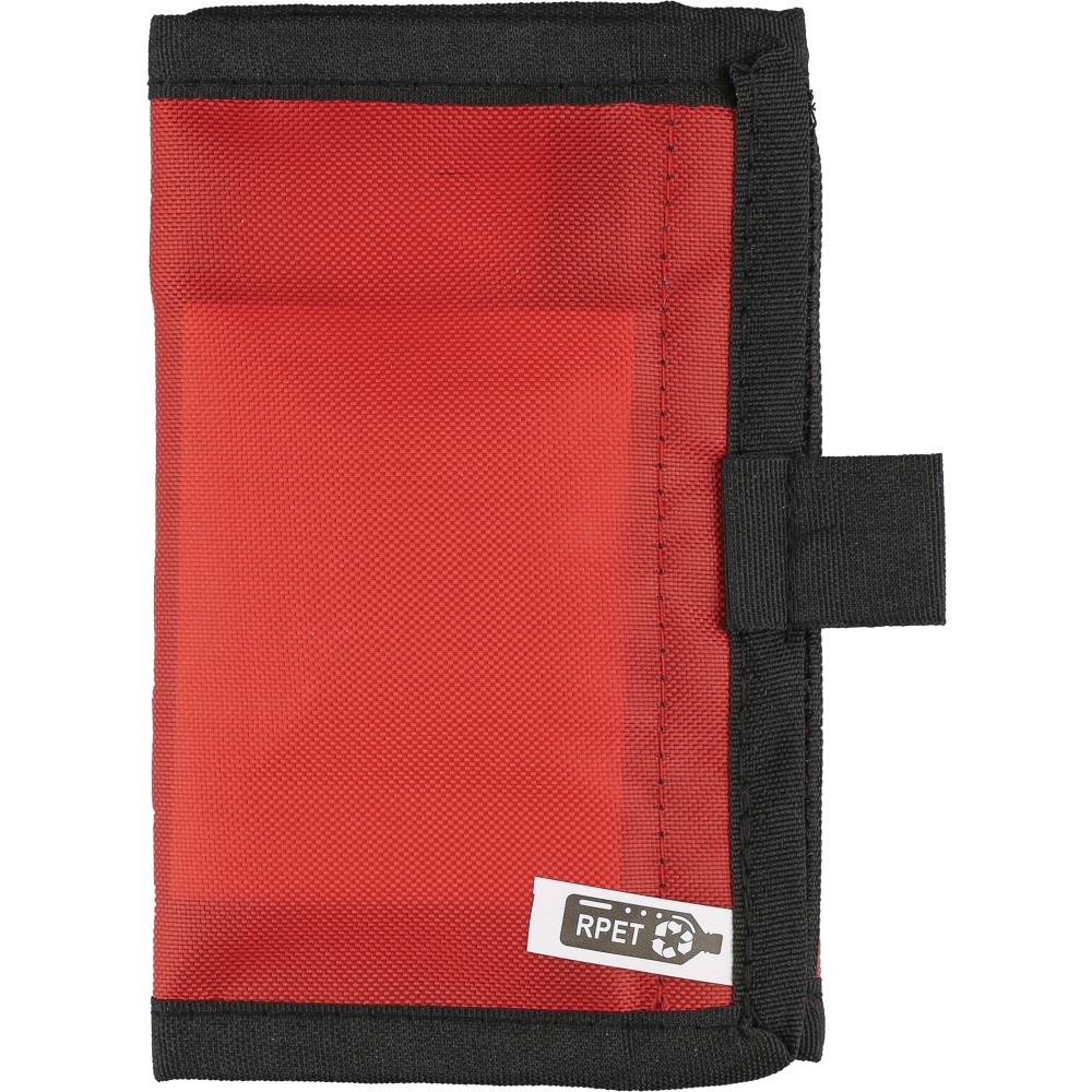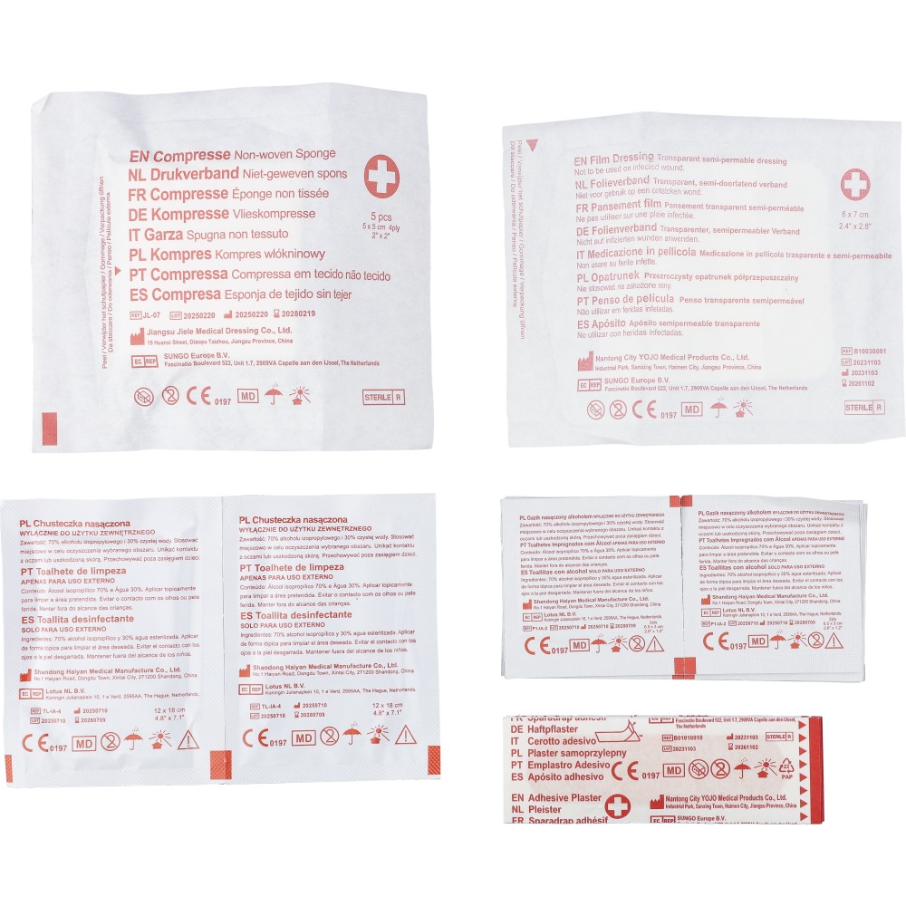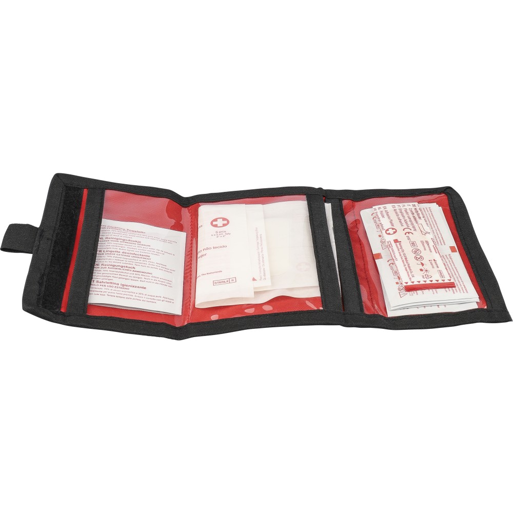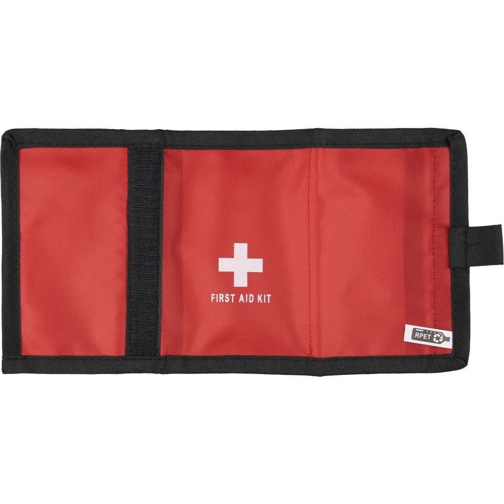 RPET 600D poliészterből készült elsősegélytasak tépőzárral és hordozópánttal. Tartalma: 5 sebtapasz, 1 steril fedőkötés, 1 nemszőtt törlőkendő, 8 alkoholos törlőkendő és 2 tisztítókendő. A külső felületen rPET címke található.
