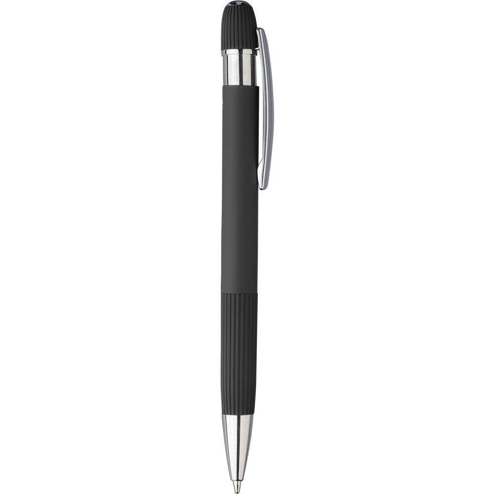 Újrahasznosított alumínium golyóstoll gumírozott felülettel. Csíkos részletekkel a markolaton és a tetején, krómozott műanyag heggyel és fém klipsszel ellátott nyomógombbal. Lézergravírozott újrahasznosított logóval. Kék tintával.