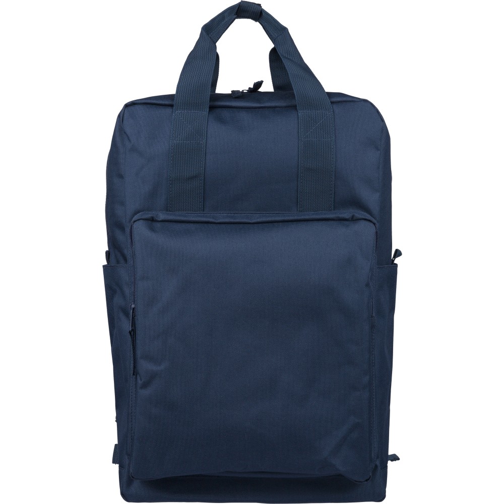 Újrahasznosított 900D poliészterből készült hátizsák, 210D béléssel és rPET címkével. Tágas fő rekesszel rendelkezik, 16?-os laptop számára kialakított külön zsebbel, elülső rekesszel, két oldalzsebbel, valamint bőröndre rögzíthető pánttal (trolley strap). Felső fogantyúi gombbal összefoghatóak, vállpántjai szellőző kialakításúak a kényelmes viselet érdekében.