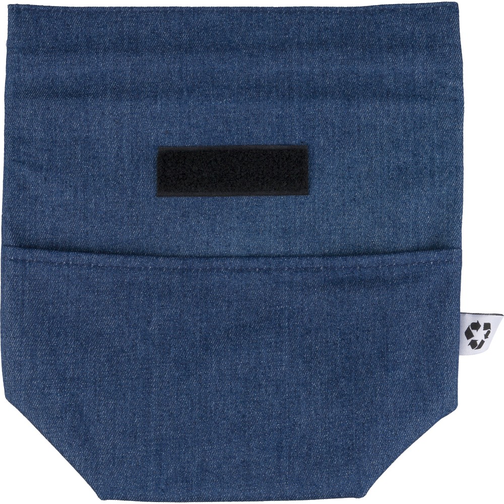 Újrahasznosított farmeranyagból készült, 27 × 10 × 31 cm méretű roll-top kialakítású hűtőtáska tépőzáras záródással, PEVA belső réteggel és rövid fogantyúval. Elülső zsebbel és a külső felületen elhelyezett újrahasznosított alapanyagra utaló címkével ellátva.