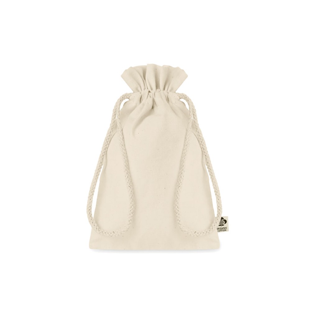 Kis húzózsinóros ajándéktasak biopamutból. Méret kb. 14x22 cm. 105 g vastag anyag.
