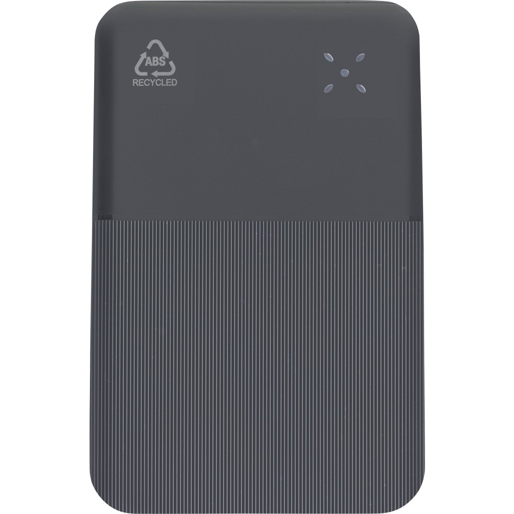 Újrahasznosított ABS anyagból készült powerbank 10 000 mAh kapacitással és 22,5 W gyors töltési teljesítménnyel. Type-C in/out és Type-A bemenettel, digitális kijelzővel, sima és texturált felülettel. Biztonsági védelmekkel ellátva. A hátoldalon gravírozott recycled (újrahasznosított) alapanyagra utaló logó található. Selyempapírral bélelt barna dobozba csomagolva.