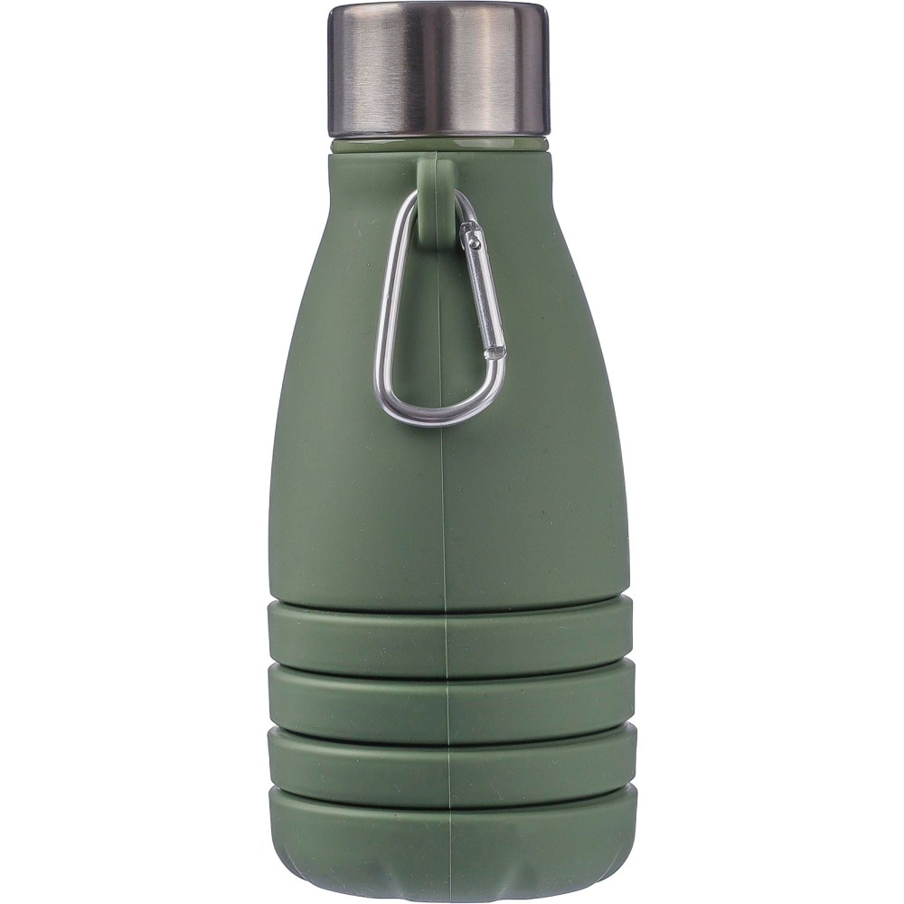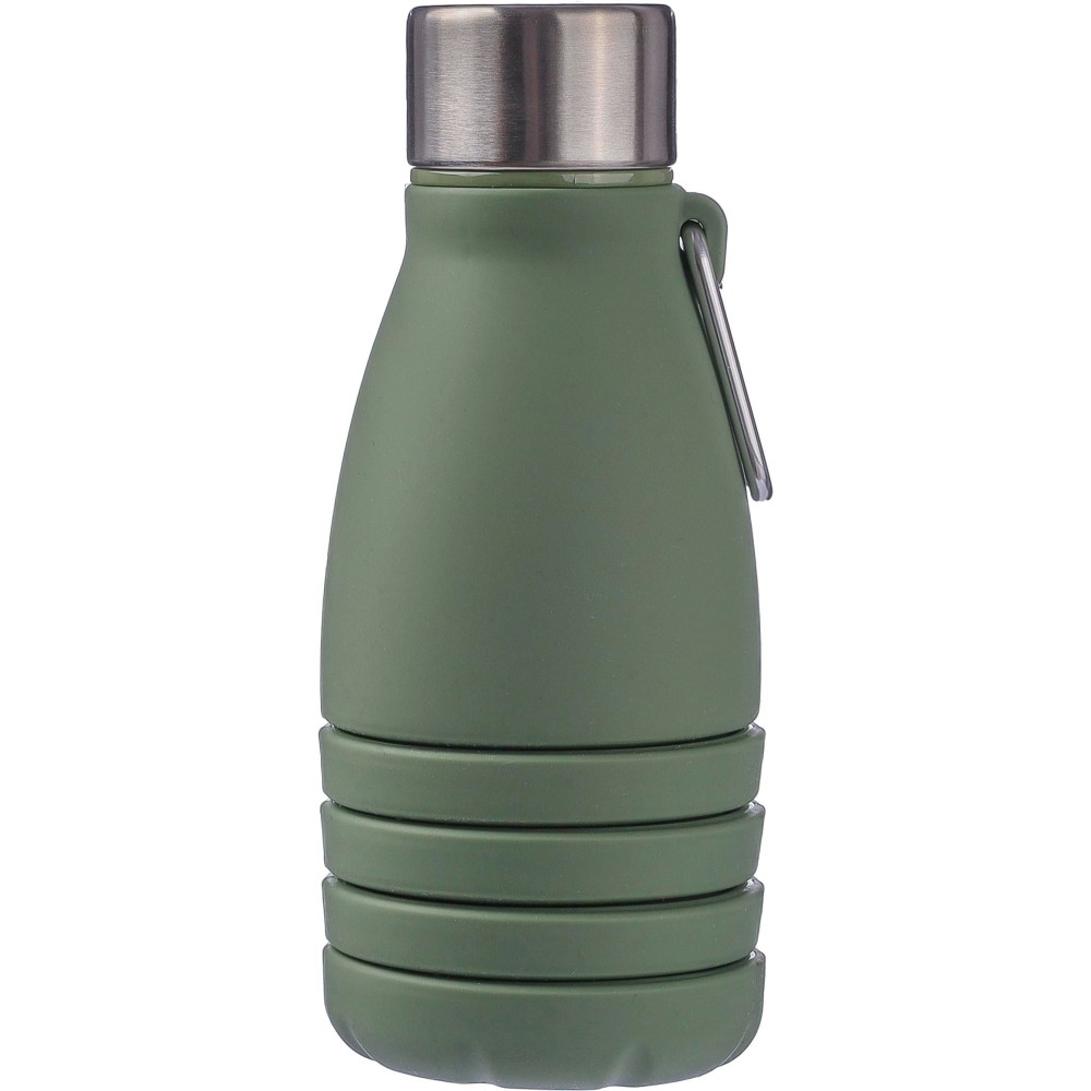 Összecsukható palack rozsdamentes acél fedéllel és alumínium karabinerrel. Összecsukott méret: d: 7x17 cm, kinyitott méret: d: 7x25 cm. Nincs egyenként csomagolva. Anyaga: szilikon. Űrtartalom: 550 ml.