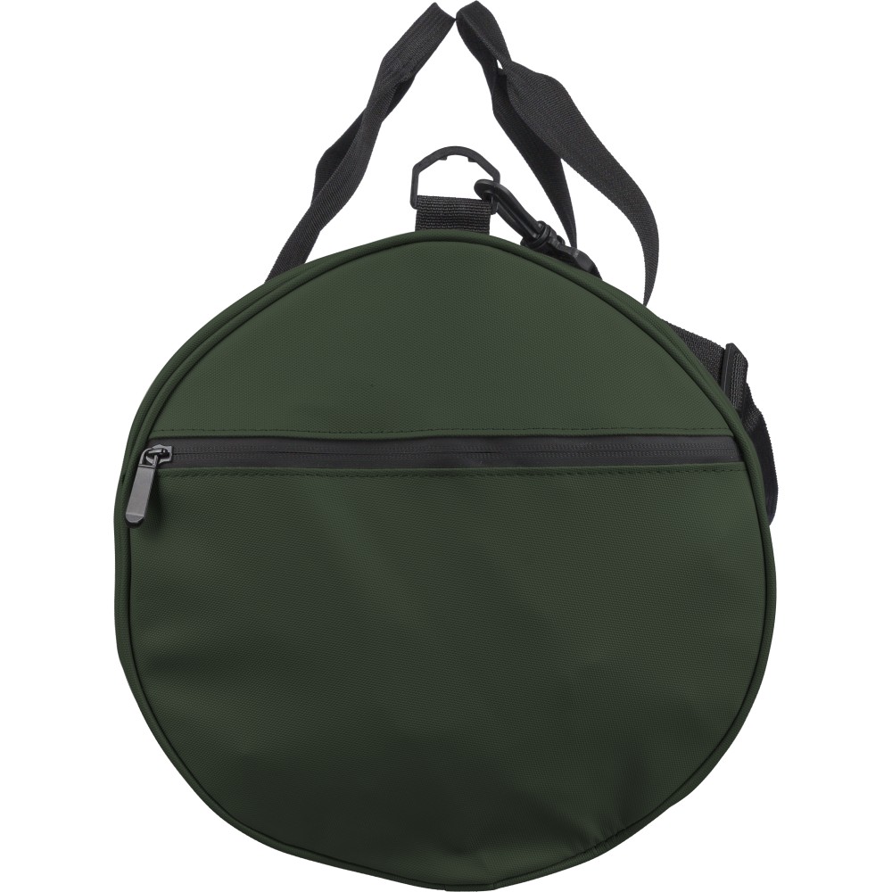 600D poliészterből készült rPET sporttáska 210D béléssel és vízlepergető PU bevonattal, 40 literes űrtartalommal. Elülső és oldalsó cipzáras zsebbel, hálós oldalzsebbel, két fogantyúval és állítható vállpánttal rendelkezik. Külső felületén rPET címkével ellátva.