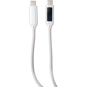 Töltőkábel alumínium csatlakozókkal. Hossza: 1 méter. USB-C-ről USB-C-re. Teljesítmény: 100 W. Kék töltési sebességet jelző lámpa az egyik aljzaton. Barna kartondobozba egyedileg csomagolva. Adatátviteli sebesség 480 Mbps.